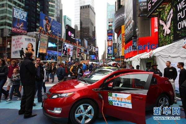 4月22日,在美国纽约时报广场,市民观看雪佛兰沃蓝达VOLT增程型电动车。新华社发(吴凯翔摄)