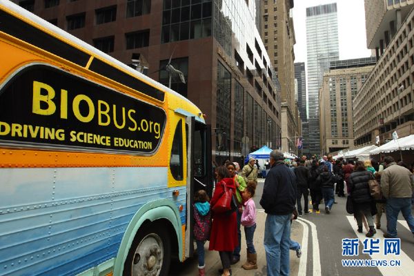 4月22日,一辆环保宣传车停在美国纽约大中央车站,向儿童进行科普教育。新华社发(吴凯翔摄)
