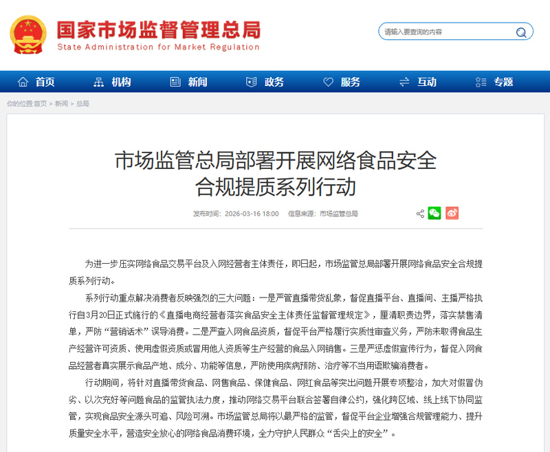 为进一步压实网络食品交易平台及入网经营者主体责任,即日起,市场监管总局部署开展网络食品安全合规提质系列行动。
