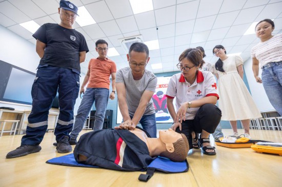 云南省急救中心的医师讲授心肺复苏方法技巧。新华社记者 胡超 摄