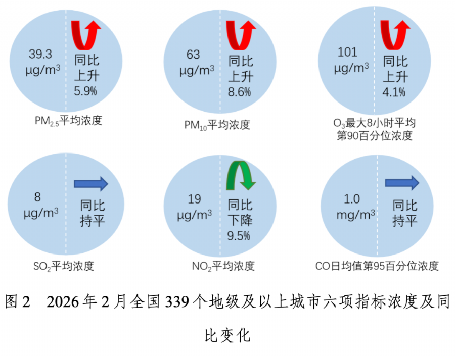 2月,全国339个地级及以上城市PM2.5平均浓度为39.3微克/立方米,同比上升5.9%;PM10平均浓度为63微克/立方米,同比上升8.6%;O3平均浓度为101微克/立方米,同比上升4.1%;SO2平均浓度为8微克/立方米,同比持平;NO2平均浓度为19微克/立方米,同比下降9.5%;CO平均浓度为1.0毫克/立方米,同比持平。