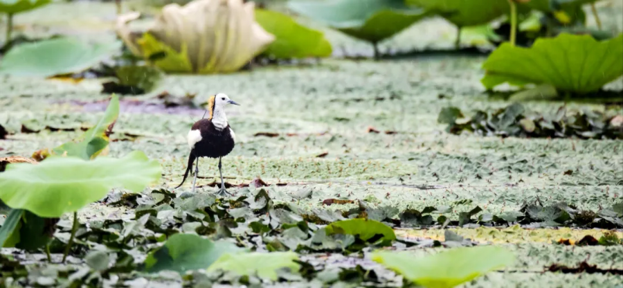 据了解,水雉是一种对水质和生活环境要求很高的珍稀鸟类,主要栖息于富有挺水植物和漂浮植物的淡水湖泊、池塘和沼泽地带。因其有细长的脚爪,能在漂浮于水面的睡莲、荷花、菱角、芡实等植物上来回奔走和停歇。它们以水生植物、小鱼、小虾和水生昆虫为食。