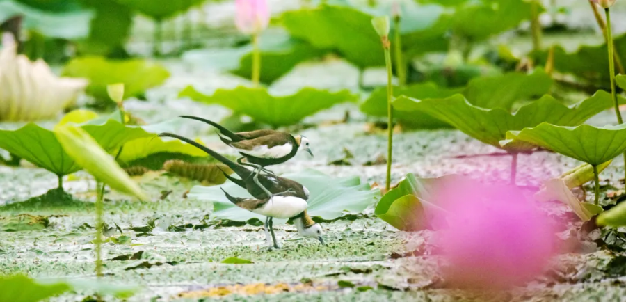 在江苏泗洪洪泽湖湿地国家级自然保护区,国家二级重点保护野生动物水雉在荷叶上或飞或站。水雉因酷似传说中的凤凰,体态优美,也被称为“水凤凰”。