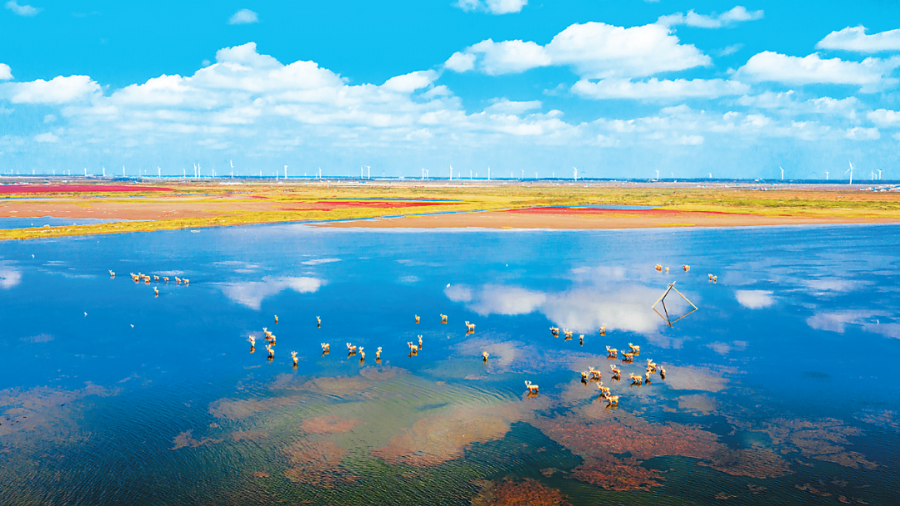 黄海之滨的湿地滩涂绿意翻涌,鹤舞鹿鸣,步步入画、处处是景。