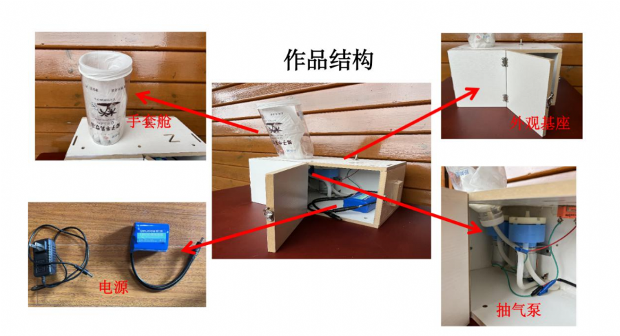 该作品主要创新点:用饮料塑料瓶做手套舱,结构简单,环保节约;用抽气泵制造负压使得手套涨大,无接触少污染,且方便快捷。。。