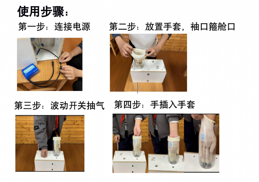 要涨大手套,我先想到“吹”,但不行会污染。后玩水枪时我得到启发:“吸”也可让乳胶手套鼓起呀!这就是负压。初步制作模型时,出现了塑料软管漏气和抽气泵功率低的问题,我更换了连接头和抽气泵。之后,针对人机交互友好问题和外观优化问题我进行了第二、三、四次改进。后来我几经测试,发现用这个装置戴手套速度明显加快,也更舒适了。