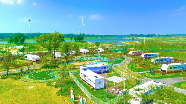为了维持水质,朱海建成1座污水处理厂和5座污水处理站,实现污水处理全覆盖,连续4年环湖植树造林1800多亩,打造梅园、南岛等生态景观,构筑起绿色生态屏障,朱海休闲运动小镇由此应运而生。小镇以“渔文化”为主线,打造了朱海渔村、房车营地、乡村民宿、度假酒店、国际路亚基地、水上运动户外营地等配套设施,培育了休闲运动、乡村度假、渔乐美食、研学游乐四大业态,成功探索出一条“生态修复+农文体旅融合+乡村振兴”的可持续发展道路。李金艳介绍,“自运营以来,项目不仅很快成为淮海休闲运动网红打卡地,而且带动就业1500余人,促进集体经济增收400万元。”