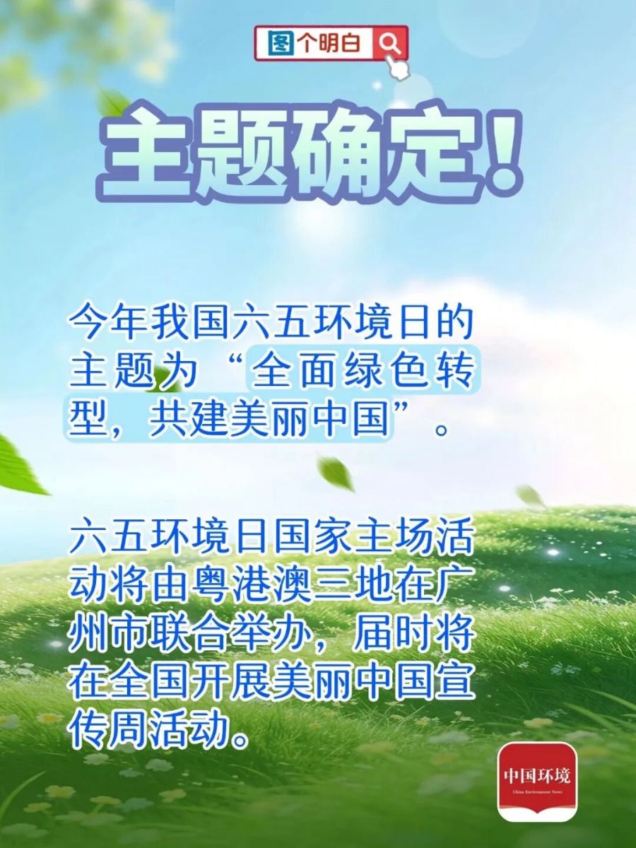 6月5日是世界环境日。今年我国六五环境日的主题为“全面绿色转型,共建美丽中国”,旨在全面贯彻落实党中央决策部署,牢固树立和践行绿水青山就是金山银山的理念,以碳达峰碳中和为牵引,协同推进降碳、减污、扩绿、增长,筑牢生态安全屏障,增强绿色发展动能。同时号召全社会积极践行绿色生产生活方式,为实现“十五五”时期美丽中国建设目标汇聚磅礴力量。
