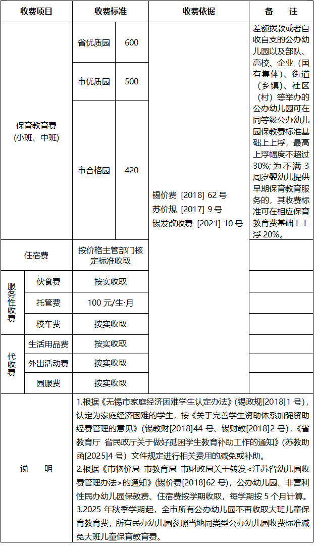1、无锡市区公办幼儿园收费表(单位:元/生·月)