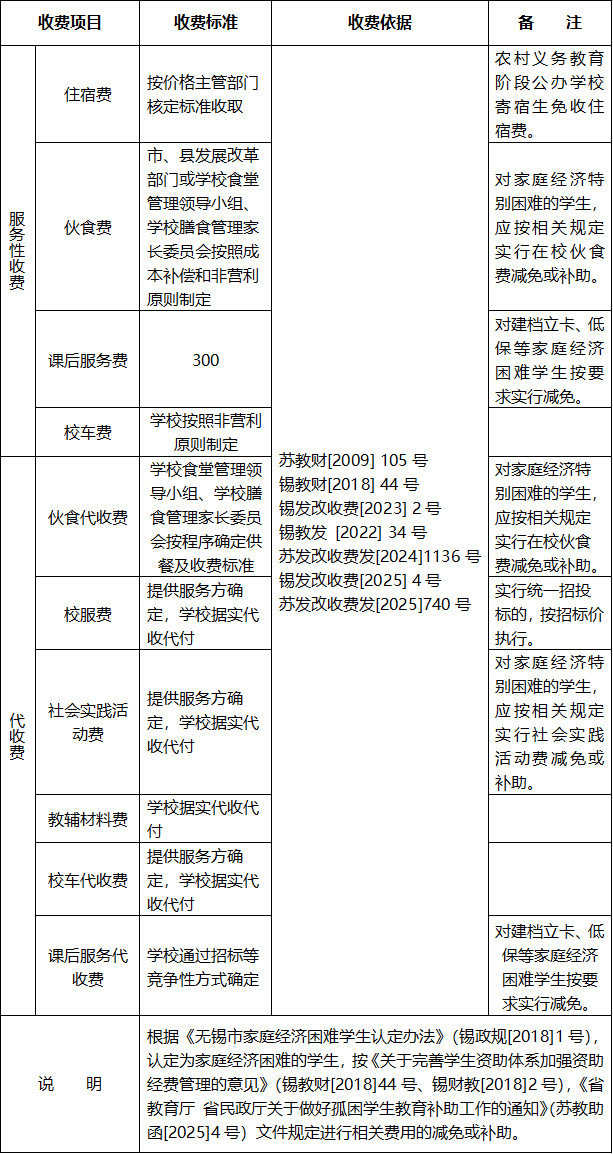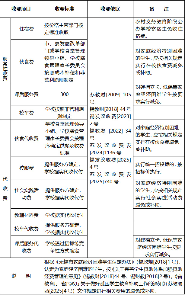 2026年春季学期无锡市区中小学(幼儿园)收费表