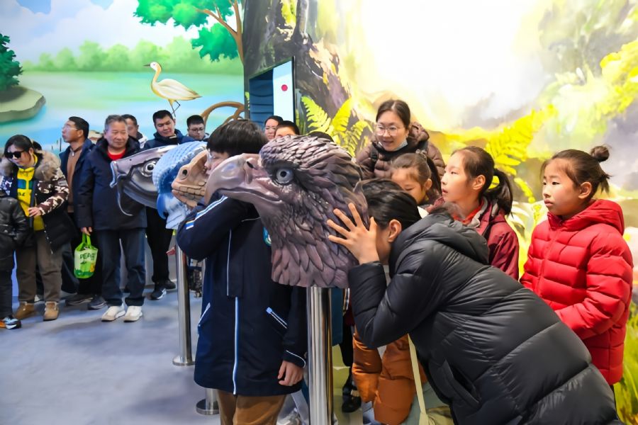 在沉浸式交互影厅,孩子们通过《羽翼之下》影片,见证了月牙岛从荒芜堆场蜕变成草木葱茏的湿地乐园。大家还通过拍打墙壁与投影中的动植物“互动”,解锁了震旦鸦雀、白琵鹭等珍稀鸟类的秘密,也在心中种下了探索自然的种子。
