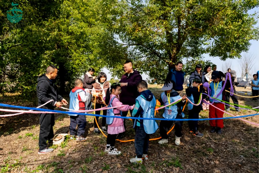 “老树”张开双臂站在外圈,“小树苗”在中间喊着“好饿”,“菌丝信使”手持彩色毛线在大树小树之间奔跑连接。当一棵“小树”缺营养时,所有“菌丝”合作传递“养分”;当“害虫”来袭,红色预警信号顺着毛线飞速传遍整片“森林”——这不是游戏,而是《一棵树与一片林的秘密对话》情景剧的现场。