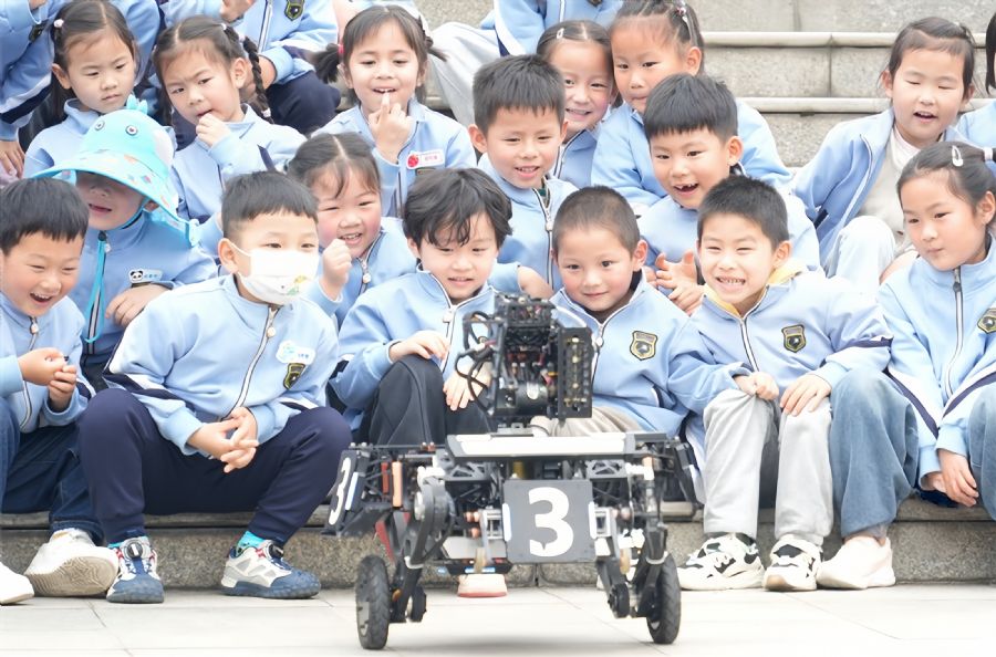 4月16日,镇江市九华山庄幼儿园的小朋友在江苏大学众创空间好奇地观察智能车结构。当日,九华山庄幼儿园开展科普研学活动,组织师生走进江苏大学众创空间,在参观互动中感受科学魅力。於伟杰 摄 视觉江苏网供图