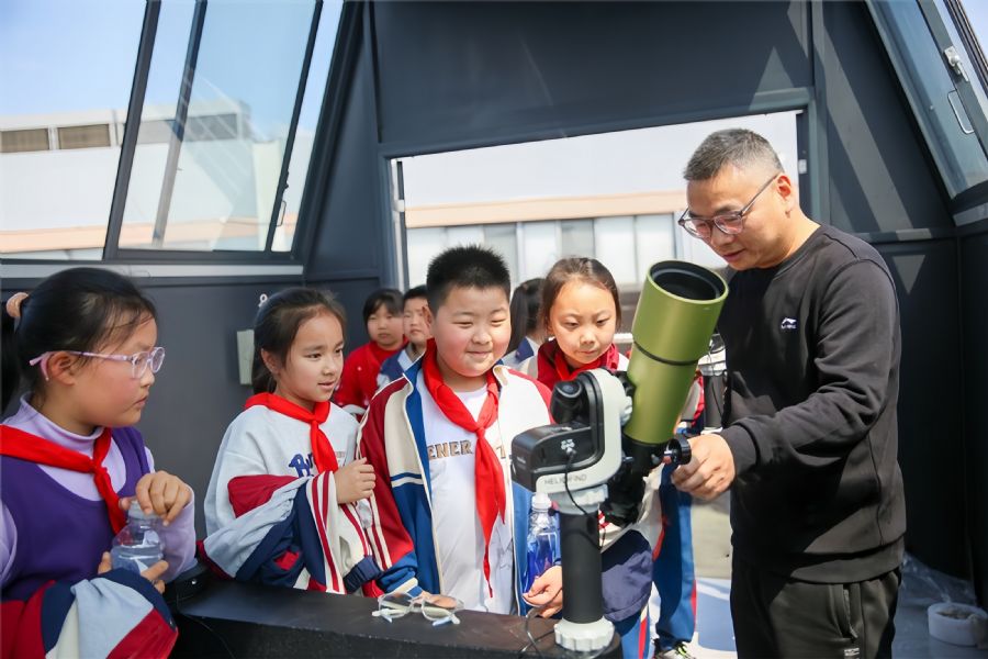 4月15日,如皋市安定小学研学队伍走进南通斯密特森光电科技有限公司,参观望远镜博物馆,体验观测太阳黑子与日珥,在科普实践中感受光学科技的魅力。徐慧 摄 视觉江苏网供图