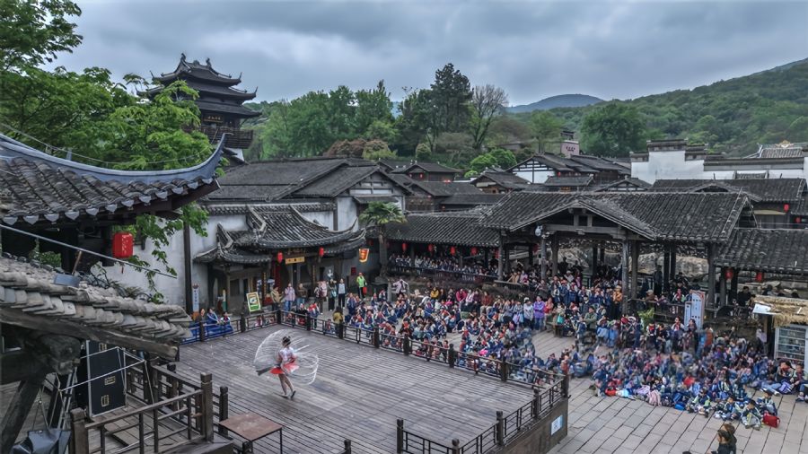 4月16日,学生在句容宝华山千华古村观看民俗表演。春暖花开,句容宝华山以学生春游为切入点,用研学丰富旅游内涵,用体验激活消费动力。杨志国 纪飘 摄 视觉江苏网供图