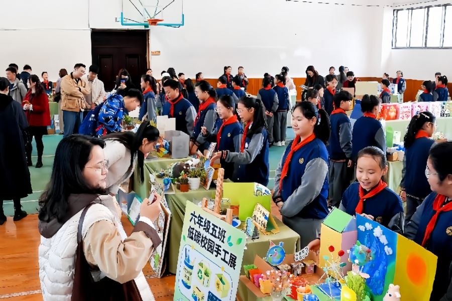 活动现场,四节生态文明跨学科展示课同步开讲:报告厅内,四年级学生探索“变废为宝”的绿色智慧;实验室里,三年级 “小小研究员”揭秘海洋污染真相;STEM 教室中,二年级孩童跟随 “滴滴”开启水资源之旅;美术室里,四年级学子用艺术与科技对话“风光互补”路灯,呈现生态教育与多学科深度融合的无限可能。