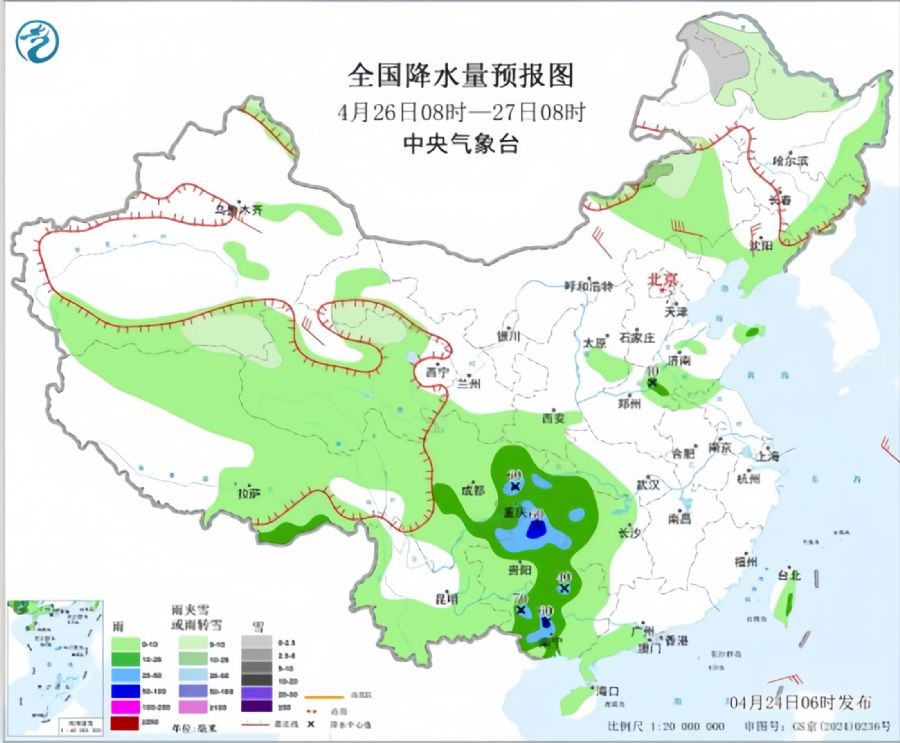 4月26日08时至27日08时,内蒙古东北部、黑龙江西北部、青海北部、甘肃祁连山等地部分地区有小雪或雨夹雪;西南地区东部、湖北西南部、湖南西部、广西中西部、山东西南部等地部分地区有中到大雨,其中,广西中部、贵州东北部、四川东部等地部分地区有暴雨(50~70毫米)。内蒙古中部、辽宁中部、新疆沿天山地区、青海西部等地部分地区有5~6级风。