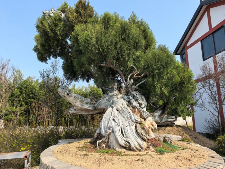 图为笔者拍摄的某盆景园下山古柏树根