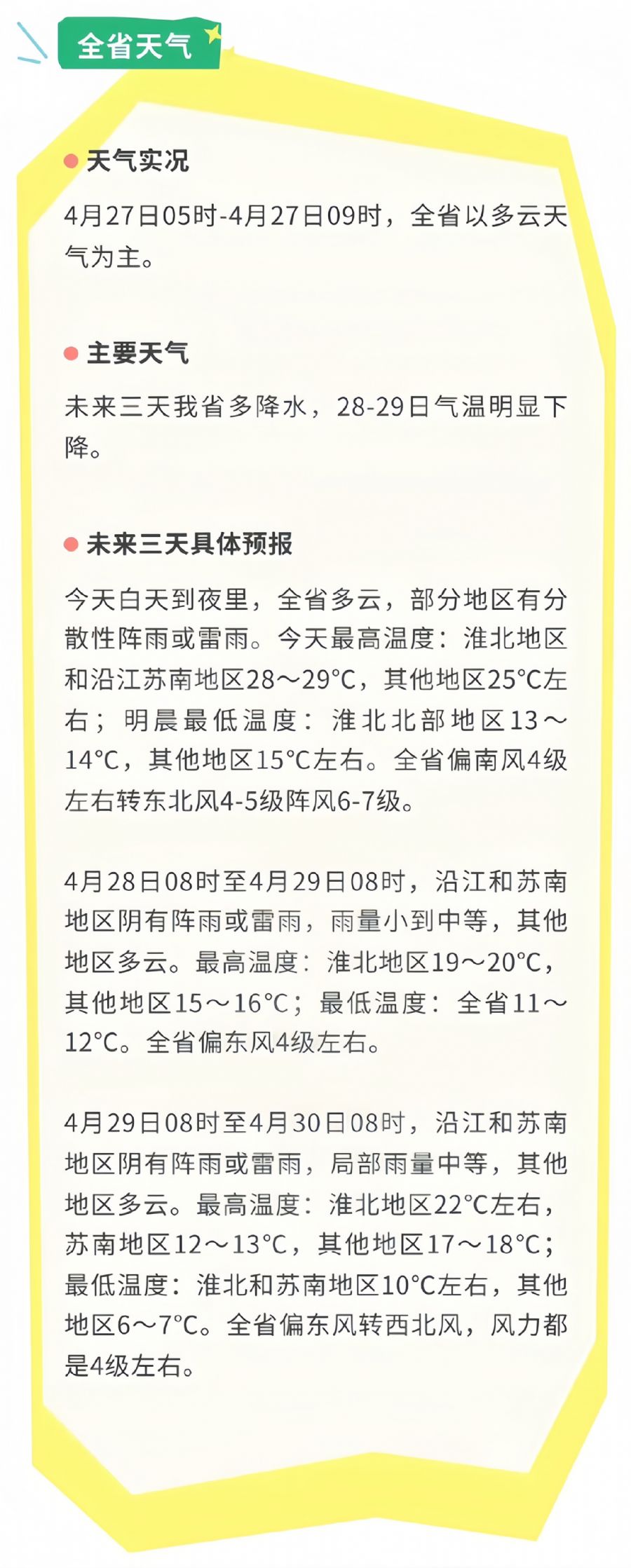 4月27日,沿江以北地区多云到阴有分散性阵雨或雷雨,局部雨量中等,其他地区多云转阴有阵雨或雷雨;今天白天到夜里,全省多云,部分地区有分散性阵雨或雷雨,今天最高温度淮北地区和沿江苏南地区28~29℃,其他地区25℃左右,明晨最低温度淮北北部地区13~14℃,其他地区15℃左右。